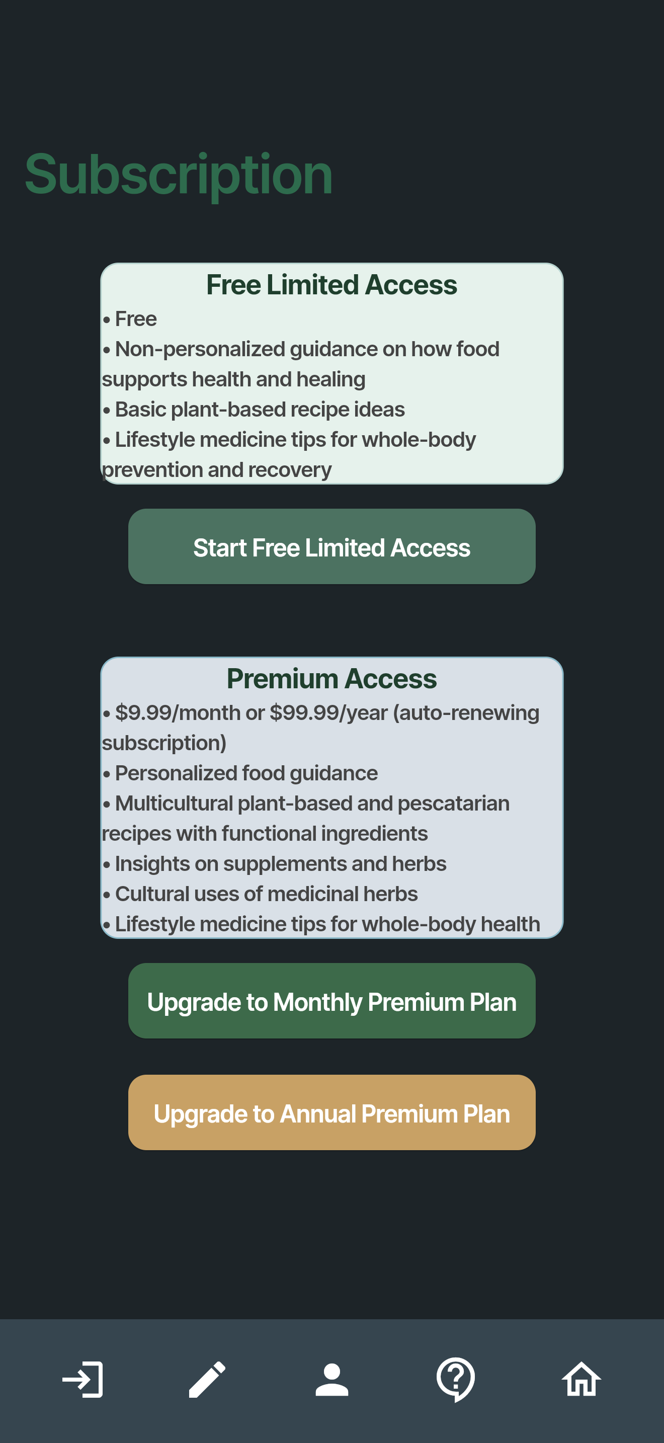 Start with the free Basics tier for general food-as-medicine guidance, recipes, and lifestyle tips — or upgrade to Premium for personalized nutrition answers, supplement support, and cultural food wisdom.